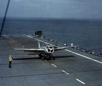 Die ab Sommer 1943 ausgelieferte und deutlich leistungsfähigere F6F-3 "Hellcat" kamen jedoch für CVE nicht in Frage, da sie von den Flottenträgern dringend benötigt wurden. Eine Ausnahme bildeten nur die vier Träger der Sangamon-Klasse, die eine Air Group aus F6F Hellcat und im Einzelfall dazu eine VC-Squadron an Bord hatten. Auf Trägern der "Casablanca"-Klasse waren FM- Wildcats und TBM- Avengers Standard. Was den jeweiligen Anstrich anbelangt, siehe: "Farben US Navy 1941-1945". Anmerkung: Wie unten auf einem originalen Farbfoto von 1944 zu sehen, waren die Decks aller (!) Flugzeugträger nicht holzfarben, sondern mit einer Schutz- und Tarnfarbe versehen. Blaugrau, später Blauschwarz (s. Seite "Farben...") . Wenn ein Deck auf einem Foto braun erscheint, ist ein ursprüngliches Schwarzweißfoto unrichtig nachkoloriert worden. Der Träger selbst war in verschiedenen "measures" getarnt.