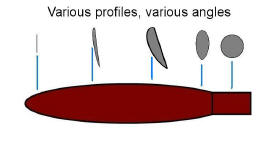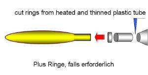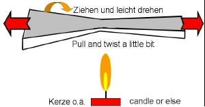 Plastik über einer Kerze o.ä. erwärmen. Wenn das Material anfängt, weich zu werden, die Enden langsam auseinander ziehen und dabei gleichzeitig gegeneinander verdrehen (das ergibt die Schränkung des Blattes, d.h. die Verringerung des Anstellwinkels). | ||||||||||