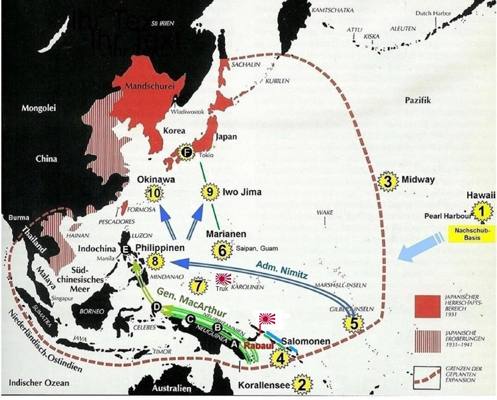 • US Army:  Von Guadalcanal und die Salomonen über Neuguinea zu den Philippinen.  Von dort gemeinsam mit US Navy und Marine Corps nordwärts bis Japan.