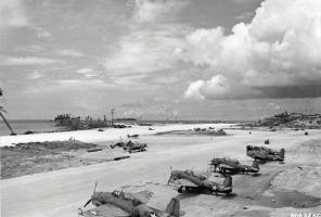 Nachdem sich das Gemeinschaftsunternehmen von US Army, Navy, Marine Corps und Neuseeland, Rückeroberung der rund 1.000 km langen Inselkette der Salomonen im Herbst 1943 dem Ende zuneigte, konnte Admiral Nimitz daran gehen, sich eigenen Aufgaben zuzuwenden. Erster Schritt waren im November 1943 die Gilbert Inseln am östlichen Ende des japanisch besetzten Gebiets, rund 1.200 km von Guadalcanal entfernt. Hauptziel war das Tarawa Atoll mit seiner Hauptinsel Betio, nur 3.200 m x 720 m (3.500 x 788 yds) groß, aber mit einem gut ausgebauten Flugplatz. Zur Ablenkung vom eigentlichen Angriffsziel sollte parallel dazu die Einnahme der Atolle Apamama/Abemama und Makin/Butaritari erfolgen. Hierzu war stand am 20.November eine Flotte aus 17 Flugzeugträgern mit rund 850 Flugzeugen, zwölf Schlachtschiffen, acht schweren Kreuzern, vier leichten Kreuzern, 66 Zerstörer, und 36 Transportschiffen mit zwei Divisionen der Marineinfanterie bereit. Tarawa und Makin fielen nach drei Tagen, das am 21.11. angegriffene Apamama am 25.11.1943. Betio auf Tarawa erhielt von zwei Geleitträgern 44 F6F-3 Hellcat Jäger, um die Stellung zu sichern.  Nächster Schritt waren die nordwärts gelegenen Marshall-Inseln, hier sollten die dringend benötigten Anker- und Nachschubbasen für die Flotte entstehen.  Das Majuro-Atoll rund 750 km nördlich von Tarawa bildete am 31.01.1944 den Anfang, ohne eigene Verluste an einem Tag eingenommen. Die Einnahme der Inseln Roi und Namur des Kwajalein-Atolls, 680 km nordöstlich von Majuro gelegen, war schwieriger und dauerte vom 31.01 - 07.02;  Eniwetok mit der Hauptinsel Engebi, 600 km weiter westlich, folgte 17.-23.02.1944. Mit auf diesen drei Atollen stationierten Flugzeugen des US Marine Corps und der US Army Air Force konnte ein weites Gebiet überwacht werden. Die übrigen japanisch gehaltenen Inseln der Gilbert- und Marshall-Inseln bildeten damit keine Gefahr für den weiteren Vormarsch nach Westen und konnten sich selbst überlassen werden. Ob sie Nachschub erhielten oder nicht, war belanglos. Das Ulithi-Atoll auf den Karolinen-Inseln bildete schließlich die Ausgangsbasis für alle Operationen 1945.