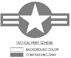 From 1980 to 1982, the U.S. Navy developed a camouflage pattern in shades of gray for aircraft on tactical missions, including the insignia. Each type was given its own design. In the insignia, the previous "Insignia White" was replaced by the color of the aircraft paint at that location. Instead of "Insignia Blue" and "Insignia Red" the contrasting lighter or darker gray. |