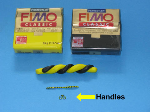If the ship is in motion it needs a bow wave and some equally wedge shaped ones behind as well as a distinct foaming stern wave at the rear. Bow and adjacent waves are formed as mentioned above, the stern wave needs a different treatment. For a foamy appearance I use a pencil to make little holes and a stiff brush to accentuate this further till an uneven spongy surface is obtained. Though Fimo can be painted to any desired color, it's not a bad idea to use some white Fimo for the bow wave and stern wave. Pressing the ship into the Fimo surface for a moment gives a clear indication where the waves have to begin (do not leave it in Fimo for a long time because unhardened Fimo melts plastic).