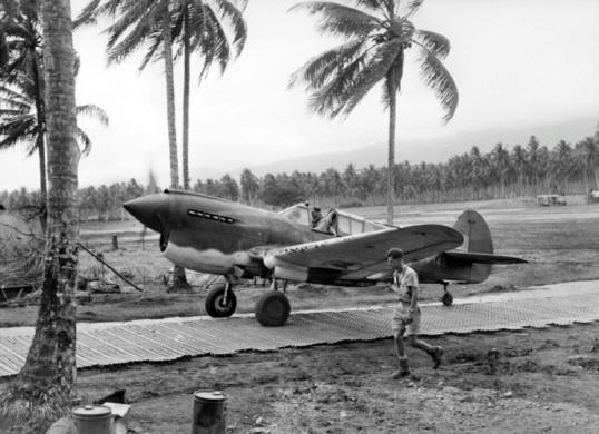 | RAAF Sqn.L. Keith W "Bluey" Truscott taxiing his P-40E Kittyhawk along the Marston Mats at Milne Bay Fighter Strip #3, Milne Bay, New Guinea, Sep 1942. | Cleaning of 75mm anti-ship gun on US Army Air Force B-25G, 820 BS, 1944 | ||||||||||||||||||||