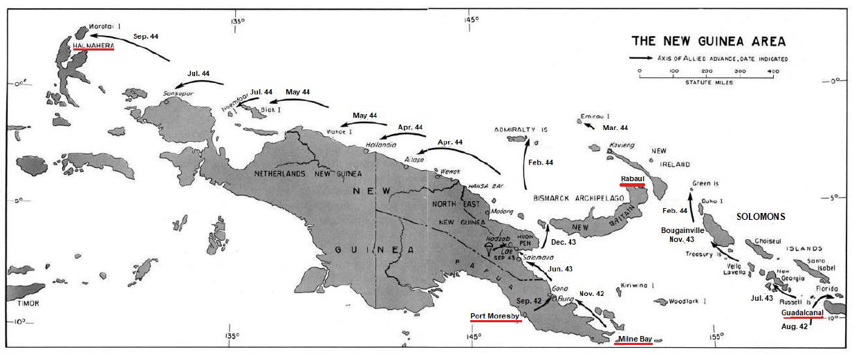 Douglas MacArthur, US Army (supported by Australia and US Navy on Papua New Guinea, on Solomon Islands by US Marine Corps, US Navy and New Zealand) |