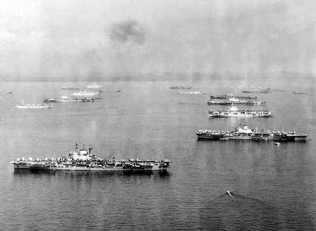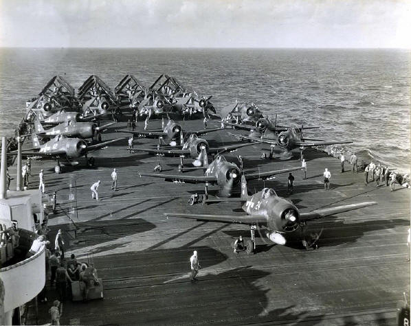 | British aircraft carriers Victorious, Formidable, Unicorn, Indefatigable, Indomitable as part of Task Force 57. | Air Group 11 launch preparations on CV-12 "Hornet" in the Philippine Sea | |||||