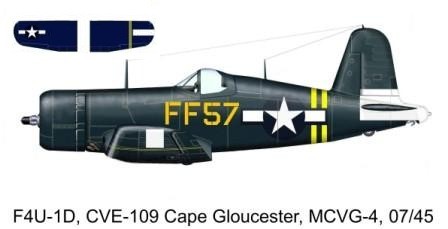 In 1945, however, most aircraft carriers also had on board at least one Marine fighter-bomber squadron equipped with F4U-1C and -D Corsair. Externally they were indistinguishable from those of the Navy. In mid-1945 the Marines even received own CVE aircraft carriers, but combat participation was very short if any. In their paint scheme, the Marines' planes were completely similar to those of the Navy, because they had been obtained from there. For the rest, however, although organizationally subordinated to the US Navy, they were relatively independent, as can be seen from their ranks (Lieutenant instead of Ensign, Captain instead of Lieutenant, and so on).