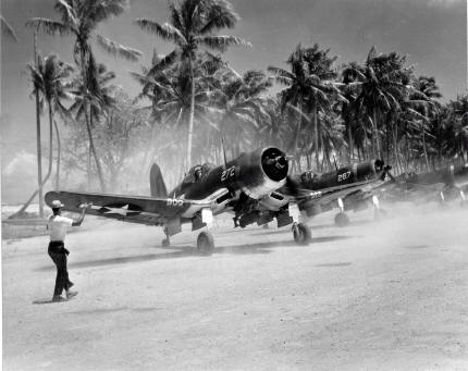 Time of carrier deployment differed greatly, ranging from half a year to some weeks. Furthermore embarked squadrons may have had had different times of assignment. For example squadrons on board CV-10 Yorktown: VF-5, 09-12/1943; VF-5, 01-02/1944; VF-1, 05-06/1944; VF-3, 01/1945; VF-9, 03-04/1945; VF-88, 06/1945. For modellers: There wasn't much time for "ageing" and in case of an emergency US Army airfields (New Guinea area) were too far away , others occupied by decidedly unfriendly people. In short: The aviator (the USAAF had pilots) got wet.