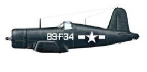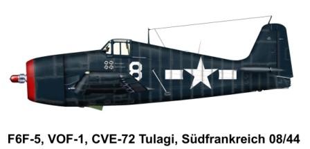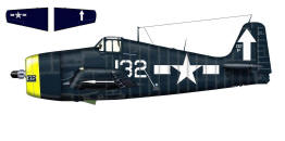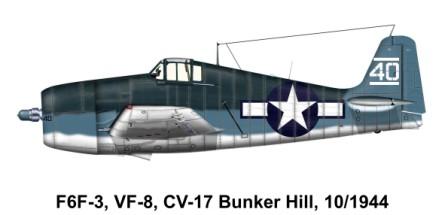 possible and moreover forbidden. Photos of David McCampbell's "Minsi III" and others by no means contradict this. Here a press campaign for the sale of so-called "War Bonds" was in the background. The planes were therefore supposed to suit the supposed taste of the audience. Another category is aircraft where names or decorations were only attached for photo shoots, but then removed again. That this was the case is not apparent from the photos. How a press photo was taken is best shown by the photograph of Maj. Gregory "Pappy" Boyington in Corsair No. 86, the photographer's aim being to show Boyington as a war hero with 20 kills. However, since there was no "plane of Maj. Boyington" anywhere (he refused any decoration in order not to draw attention to himself), the closest aircraft was simply provided with appropriate stickers, "Lulu" was written on it and, to make everything clear, his name with rank was also written on it. In the result a fake, a so decorated No. 86 never flew. Concerning George H.W. Bush and his "Barbara" named Avenger see: Kill flags: Although decoration, they were tolerated by the Navy as "morale boosters" and their appearance and size were even fixed. But since no one on board owned their own aircraft, personal kill markings made little sense. Photos showing a pilot in the aircraft with the corresponding number of launch flags were posed shots for the family album. Mostly the usual place for kill markings of any kind was on the "scoreboard" of the aircraft carrier island. The drawing of a Hellcat below left - corresponding to a (copyright) photo - shows an unusual variation. On the one hand swastikas are to be seen, on the other hand two different names behind them. The real background: On the occasion of the invasion of Southern France, two He 111s were shot down with the Hellcat No. 8 of the VOF-1 (see profile below) on August 20, 1944 and two Ju 52s on August 21, 1944. But on each day by a different pilot (Ens.A.R.Wood or Lt(jg) E.W.Olszewski). To prevent misunderstandings: There are always and everywhere exceptions. So also with the Navy, where sometime something appeared which was was not supposed to be seen. But to generalize that would be a mistake. The bans on carrier operations did not apply to aircraft on land, especially not to the Marine Corps (Marines). Here one could certainly attach name inscriptions, launch stickers and "nose art". The full decoration program on an aircraft carrier could even be seen on the CVE-107 "Gilbert Island" (see "Corsair Markings"/"TBM Markings" in Website "Adamsplanes.com". So there was nothing against the decoration of Boyington's Fake-Corsair, since he was not a member of the Navy, but of the Marine Corps VMF-214. Also the Corsairs of the VF-17 of the Navy with inscriptions on the vertical tail ("The Hog" etc.) were not covered by the prohibition of inscriptions, because they were land based like all two and three colored Corsairs of the Marines.