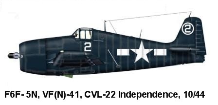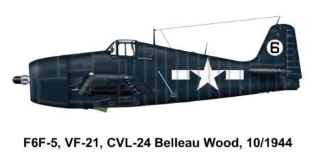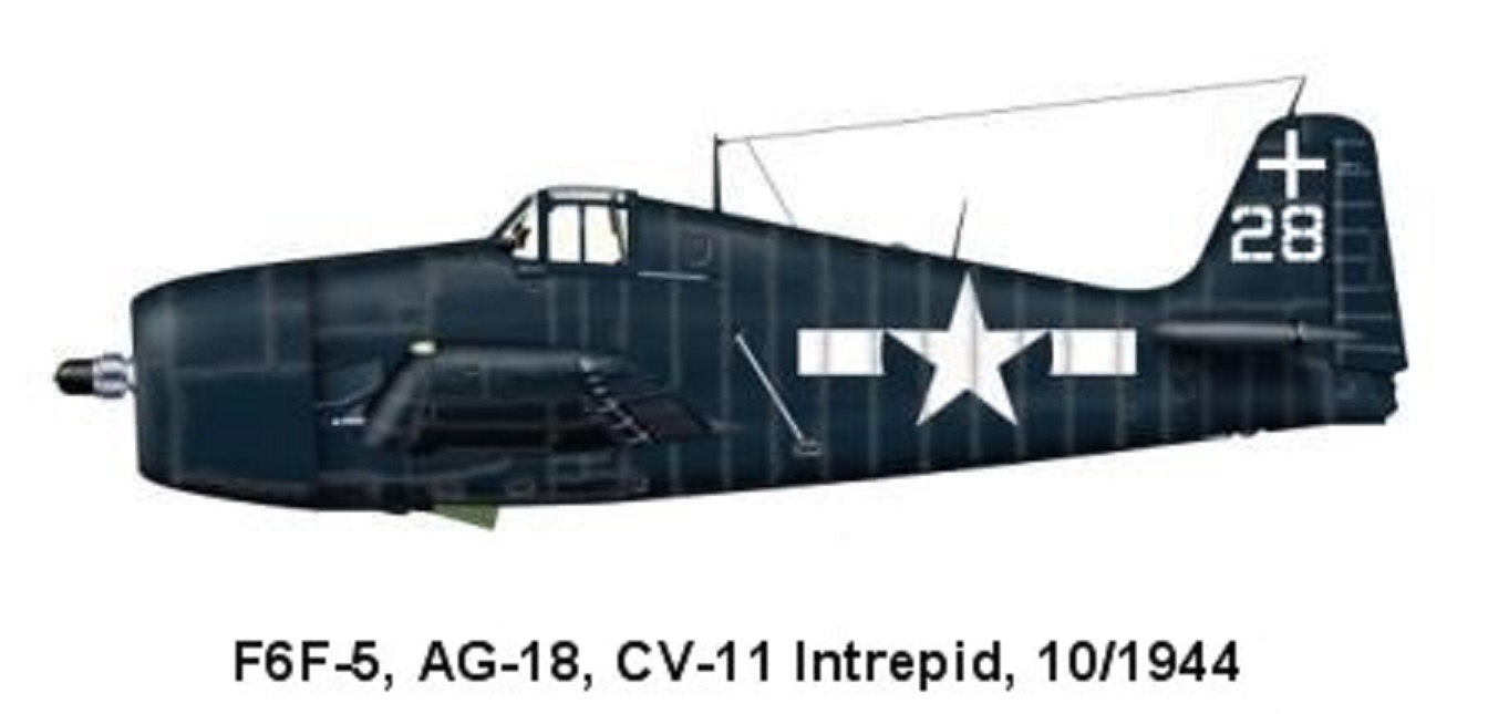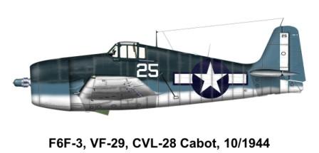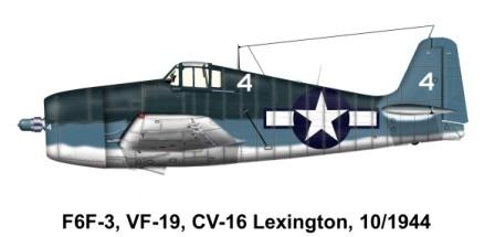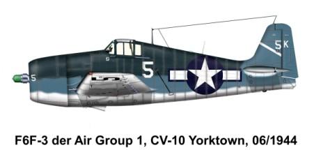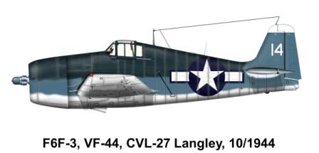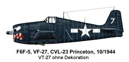 Nose Art: The fact that Navy aviators would have liked to have had a decoration à la USAAF can be seen from the spectacular decoration on the (originally still three-colored) VF-27's Hellcats, which was created before the mission. However, when CVL-23 "Princeton" was severely damaged by a bomb hit on Oct. 24, 1944 and the airborne VF-27 aircraft (now in "Glossy Sea Blue") had to land on the CV-9 "Essex", the local "Skipper" discovered disfigurement of government property. Mouth and eyes had to be painted over immediately. If somewhere Nose Art may have been seen, then only in a small version and as a (rare) exception to the rule.