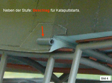 Waffenstände, Schleppantenne mit Blei-Ei und neben der Stufe den Beschlag für