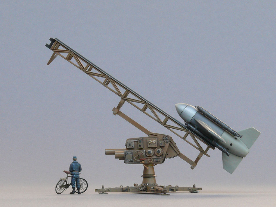 Modell Das Modell von Condor ist schon seit langem auf dem Markt, das merkt man der Qualität an. Wer ein brauchbares Modell möchte, kommt aber nicht daran vorbei und auch nicht am Eigenbau einer passenden Lafette, die die Vermessung der wenigen Fotos erfordert. Diese Eigenbau-Gitterstruktur wurde schließlich auf eine leicht modifizierte 8.8-Lafette (aus Revell-Bausatz) montiert. Der Rumpf der Enzian hatte viele Bohrungen, über deren Größe und Lage man sich an Fotos von den wenigen Originalen in Museen informieren kann. Eine Original-Enzian soll demnächst im Deutschen Technikmuseum Berlin zu sehen sei, das bereits eine „Rheintochter“ in der Ausstellung hat. Anmerkung zu den Fotos: Die zahlreichen Details kommen im „natürlichen“ Umfeld kaum zur Geltung, darum wurde hier überwiegend vor grauem Karton aufgenommen. Ein Foto zeigt den Vergleich zwischen „Enzian“ und „Feuerlilie“. |