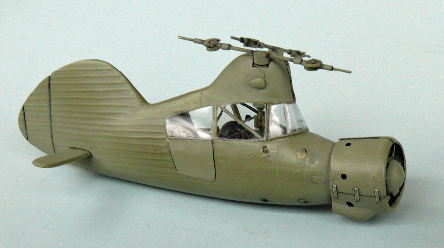 Am Modell wurde viel korrigiert und detailliert: Rumpf: Zu grob dargestellter Motor Sh 14 a ersetzt Lüfterflügel vergrößert Motorverkleidung: Scharnierband aus 0,2 mm dickem Draht, Löcher Durchsichtige linke Tür bei konventioneller rechter Tür Seitenteile Cockpitverglasung erneuert Cockpit mit Streben und Seitenfenstern. Höhenleitwerk mit richtiger Geometrie erneuert Trimmruder Seitenleitwerk angebracht Heckfahrwerk durch doppelt so großen Scratchbau ersetzt. Hauptfahrwerksstreben neu mit vorbildgerechten Breiten Getriebe und Rotoren: Beulen seitlich am Getriebeturm Details der Blattaufhängung Rotorköpfe, Rotorachsen neu und jeweils mit Zahnrad mit Details (z.B. Schlaggelenk) Rotorblätter aus 4 mm breitem Profilmaterial, Bohrungen 0,5 mm für Stahldrähte |