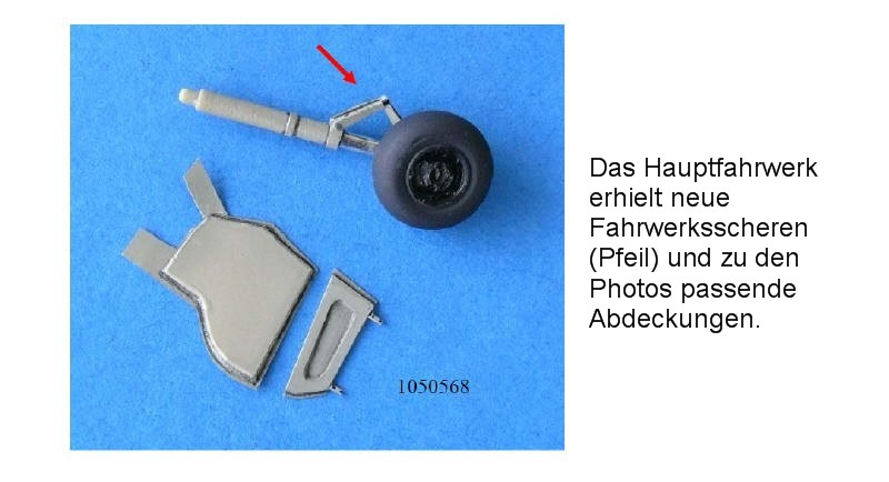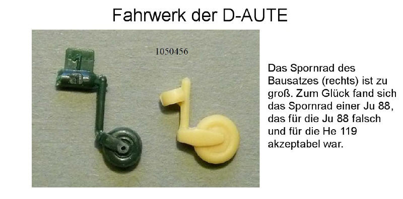 Das Fahrwerk ist um 4,2 mm zu lang, und die Radverkleidung hat eine falsche Kontur. Die dreiteilige Verkleidung wurde aus dünnem Alu-Blech neu angefertigt. Das Spornrad ist mit 7,5 mm Durchmesser zu groß, Photos geben bestenfalls 5,5 mm her.