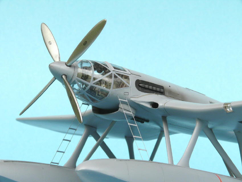 Von den Schwimmern führen Seil-Leitern zu den beiden Seiten des Cockpits. Die Leitern des Bausatzes sind viel zu grob wiedergegeben, die Seile sollten nach Photoauswertungen im Modell nur 0,15 mm Durchmesser haben. Die Leitern im Bausatz haben 7 Sprossen, auf den Fotos sind nur 6 zu sehen. Bei der Montage ist zu beachten, dass die Tragflächen beim Modell zu weit nach oben zeigen würden, wenn man nicht rechtzeitig korrigiert. Mit 0,3 mm dicken Kunststoffstreifen zwischen Rumpf und Tragflächenoberkante (bei der V1 wären es 0,5mm) werden die Tragflächen soweit herunter gedrückt, dass der Winkel etwa stimmt.
