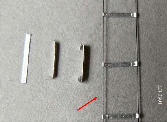 Leitern: Die Leiter im Bausatz ist herstellungsbedingt zu grob. Die strömungsgünstige Seilleiter lässt sich mit 0,15 mm dickem gerecktem Draht (Pfeil) und dünnem Aluminiumblech realistisch darstellen. |