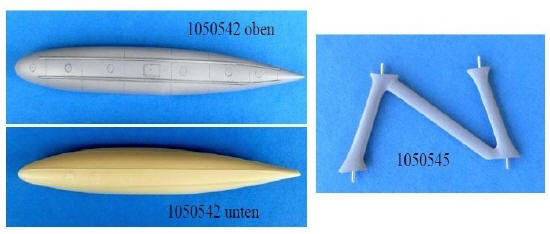Die Schwimmer des Bausatzes sind zu spitz, darum wurden die Schwimmer aus dem Bausatz der Ju 52 verwendet. Für die Verbindung der Schwimmer mit dem Modell hat der Hersteller Metallstreben beigefügt, die die Last des schweren Resin-Modells aushalten, zudem stimmen die Maße gut mit Photos überein, und die Passgenauigkeit am Modell ist vorbildlich. An dieser Stelle ein dickes Lob für den Hersteller. Zur Erleichterung der Montage und der besseren Festigkeit erhielten die Schwimmer und die entsprechenden Stellen an Rumpf und Tragflächen Bohrungen für Drahtstifte mit 0,7 mm Durchmesser. Sie wurden mit Sekunderklebergel befestigt.