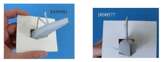 Schwimmer: Der Schwimmer des Bausatzes der He 119 (links unten) und der neu gravierte aus dem Bausatz der Ju 52 See (links oben). Die N-Strebe des Bausatzes erhält Bohrungen mit passenden Drahtstiften (rechts). |