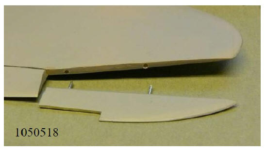 Schwimmer nach der Montage der N-Strebe und zu den Drahtstiften passend eingebrachte Bohrungen in der Tragfläche. |