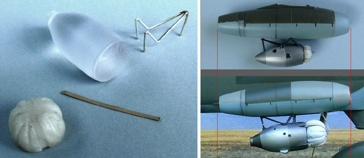 Scratchbau der Startrakete HWK 109-501 (links). Größenvergleich zwischen der Startrakete HWK 109-500 des Huma-Bausatzes (rechts oben) und der wesentlich schubstärkeren HWK 109-501 (rechts unten). |