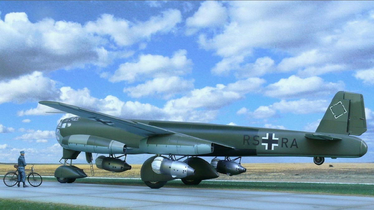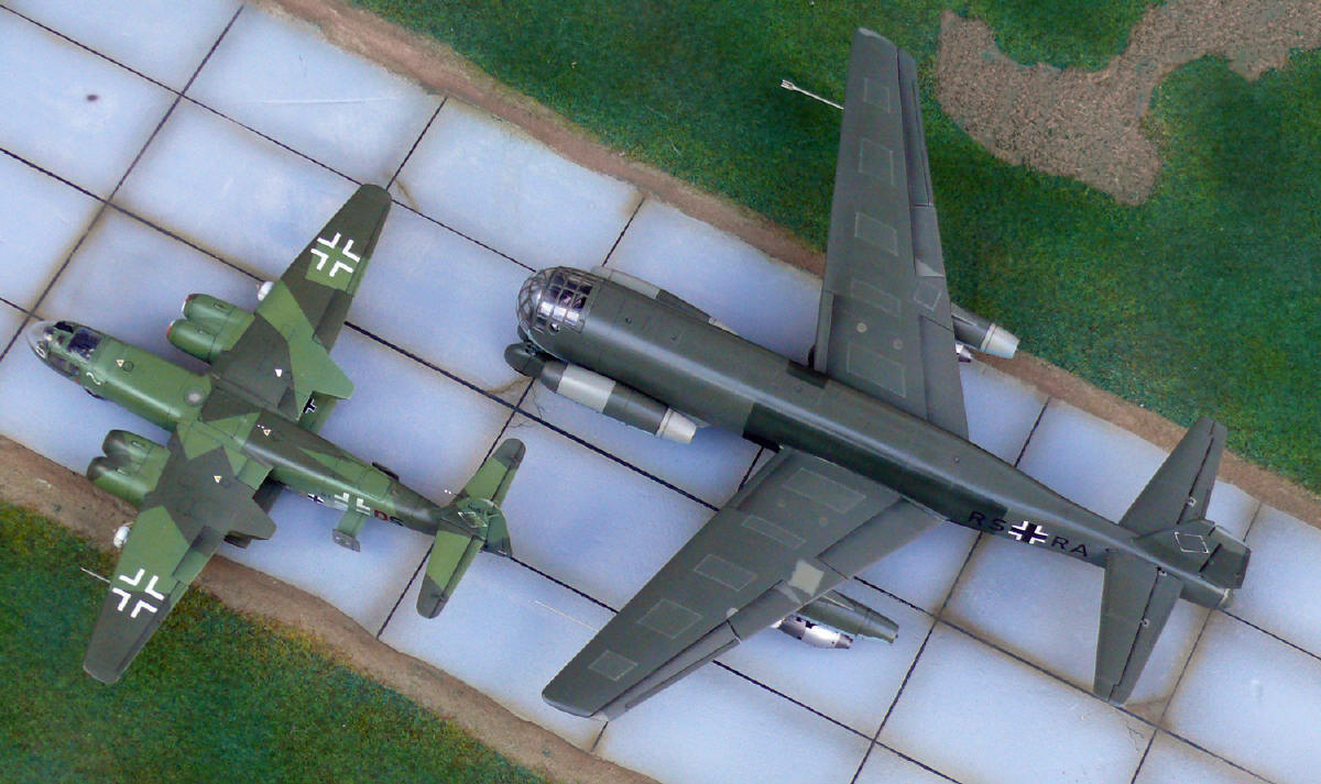 Die Größe dieses Bombers wird auch im Vergleich zur ebenso motorisierten Arado Ar 234 C-3 (hier mit untergehängter E 381) deutlich: