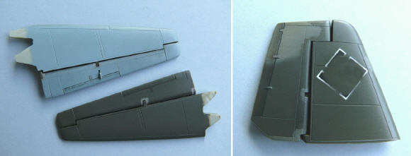 | Das Seitenleitwerk wurde durch eines aus dem Bausatz der Ju 388 ersetzt und das Ruder abgetrennt. Die Teilung der Höhenflosse erleichterte die Montage am fertigen Rumpf. Die Struktur hinter dem Spornrad ist vermutlich der Schnellablass wie bei der Ju 88. |