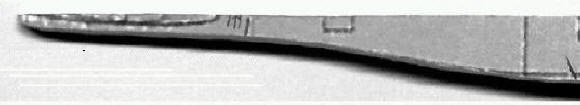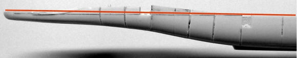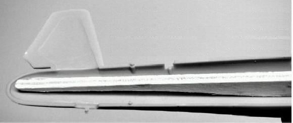 Basierend auf einer Rumpflänge von 18,30 m sollte der Rumpf des Modells 25,42 cm lang sein. Er ist aber deutlich länger, anscheinend auf eine andere Rumpflänge bezogen. Da die Tragfläche 9,2 cm von vorne beginnen soll, ist die Rumpfkürzung entsprechend zu planen: 5,5 mm vor den Tragflächen und 9,5 mm dahinter. Außerdem ist der Rumpf um 1,2 mm zu dick, das ist von der Seite her nicht zu übersehen. Die nötige Verschlankung ließ sich durch Heraustrennen schmaler Längsstreifen zu erreichen. |