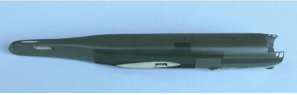 Vor dem Zusammenkleben der Rumpfhälften ist an den Ballast zu denken, damit das Modell auf dem Bugfahrwerk steht und sich nicht etwa auf sein Spornrad setzt. Das für das Blei notwendige Volumen findet sich erst hinter dem Cockpit. Wegen des kurzen Hebelarmes ist dann entsprechend mehr Blei fällig.