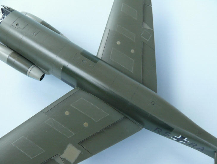 Entgegen der Anleitung besteht die Tarnbemalung ganz sicher nicht nur aus RLM 71 und RLM 65: Zwischen den Turbinen unter den Tragflächen und teilweise unter dem Rumpf war schwarzer Wärmeschutzlack aufgetragen. Darauf befand sich hinter der vorderen rechten Turbine ein Thermofarbenmuster, das bis etwa an die Hinterkante der rechten Tragfläche reichte. Es wurde nach Fotos auf dem Rechner erstellt und als Abziehbild ausgedruckt, das gilt auch für die Markierung an den Rumpfseiten. Die mit Gunzefarben lackierten Oberflächen wurden vor der Montage des Modells unter kaltem Wasser mit feinem Schleifpapier mattiert und geglättet.