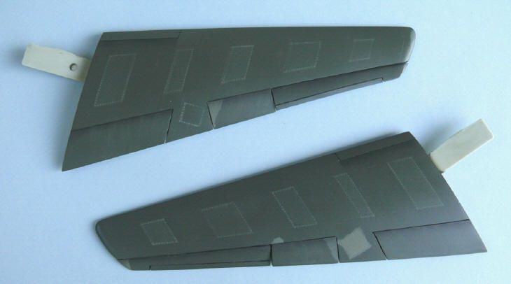 | Korrigierte und gemäß Fotos lackierte Tragflächenoberseiten. Nietenreihen mit Lochschablonen in RLM 02 lackiert |