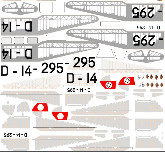 Zeichnungen der Minimoa finden sich im Internet. Sie werden auf dem Computer so skaliert, dass der Probeausdruck aus Papier auf Tragflächen und Leitwerk passt. Bei der Farbgebung ist zu beachten, was mit dem Licht an der Grenzfläche Bespannstoff/Holz des Originals passiert: Der Bespannstoff lässt Licht teilweise durch, deswegen erscheint dieser Bereich von oben in Reflexion hellgrau, von unten aber heller als die Umgebung, weil dort beim Original Licht hindurchgeht. Umgekehrt ist es bei den Holzbereichen, die kein Licht durchlassen und daher von oben heller und von unten sehr dunkel erscheinen. Die unlackierten Holzrippen sehen von oben durch den Bespannstoff hindurch hellbraun aus und von unten auf der Schattenseite dunkelgrau. Wenn diese Aspekte umgesetzt werden, entsteht die Illusion, dass Tragflächen und Leitwerk des Modells wie beim Original durchscheinend bespannt sind.