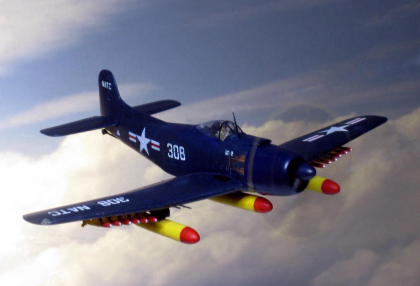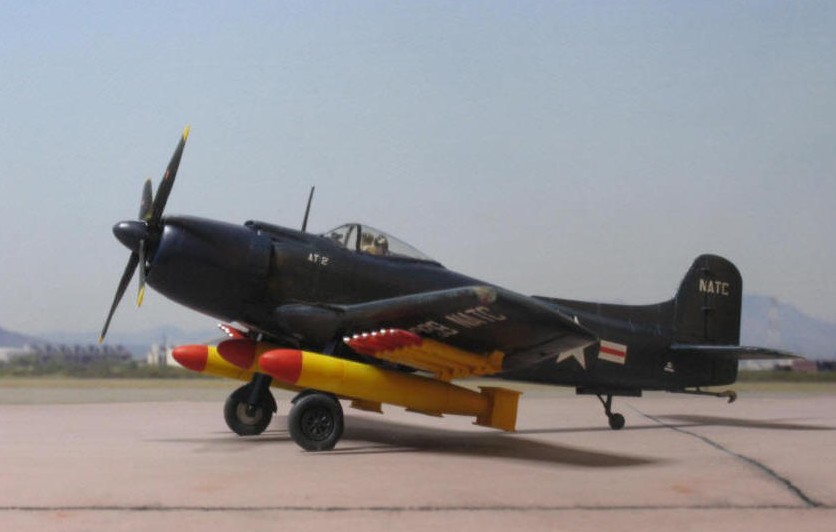 Bei meinen Modellen ist die AM-1 mit Ausnahme von Zutaten, die man nachmachen muss (Cockpithaube, Pilotenfigur und leichtgängige Luftschraube) unverändert aus dem Bausatz gebaut (Auspuffrohre sogar mit Vertiefungen!). Bei der TBY-2 wurden – ebenfalls aus o.a. Gründen - die oberen Klarsichtteile durch selbst gezogene Eigenbauten ersetzt (Befestigung mit Laschen aus Quarkbecher-Streifen, Streben aus passend bemalten Abziehbildstreifen). Bei den nur als Gravur erkenntlichen Kühlklappen in der Motorhaube sieht man der TBY ihr Alter von mehr als 15 Jahren doch an. Deshalb wurden sie durch leicht geöffnete Teile aus einem Quarkbecher ersetzt, die Auspuffrohre durch dünn gezogene Evergreen-Röhrchen. Bei beiden Maschinen laufen die Gurte (bei mir bemalte Alufolie) wie damals üblich oben über das Rohrgestänge, nicht über den Sitz. Staurohre aus ummanteltem Draht (Evergreen-Röhrchen über Kerze dünn gezogen). Die Unterflügellasten der AM-1 sind nach einem originalen Vorbild angebracht, bei den Raketen war es allerdings eine „Viecherei“, da jede nur an einem einzigen maßstäblich schmalsten Pylon hängt. Ich empfehle, dort seitlich eine Rille einzufräsen und ein später zuzuspachtelndes Stückchen Draht einzukleben, das in einem Loch im Flügel befestigt wird. |