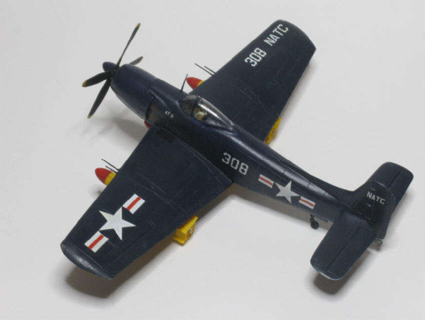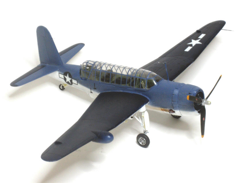 Bei der „Sea Wolf“ habe ich mich abwechslungshalber für den eigentümlichen Anstrich des Prototyps entschieden. Die Oberseite des Rumpfs müsste wegen des auf einem Farbfoto ersichtlichen Blaustichs „Blue Gray“ (nicht das grauere „Intermediate Blue“) gespritzt gewesen sein, Ober- und (abweichend von der Norm) Unterseiten der äußeren Flügel sowie die Oberseiten der Höhenruder waren „Sea Blue“, Unterseiten ansonsten „Insignia White“. Alles „non specular“, also seidenmatt. Farben der Innenseiten bei der TBY-2 spekulativ gelbgrün (Standardisiertes „Interior Green“ kam erst später; üblich war damals, die gelbgrüne Korrosionsschutzfarbe Zinkchromat mit Schwarz oder "Sea Blue" zu mischen, was dann zu unterschiedlichen Variationen führte). |