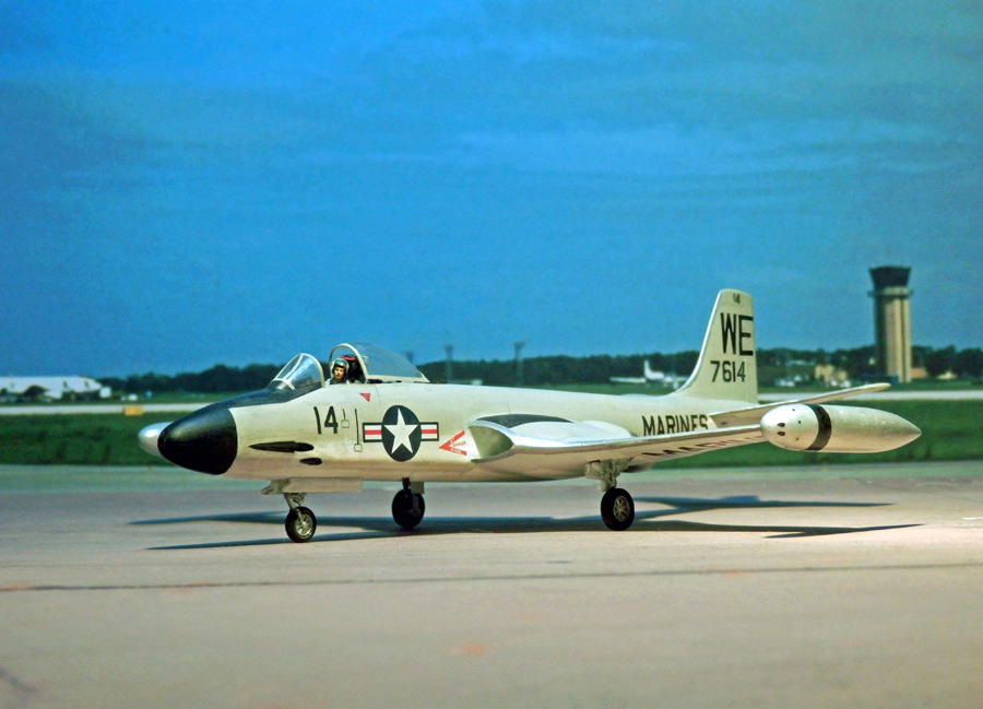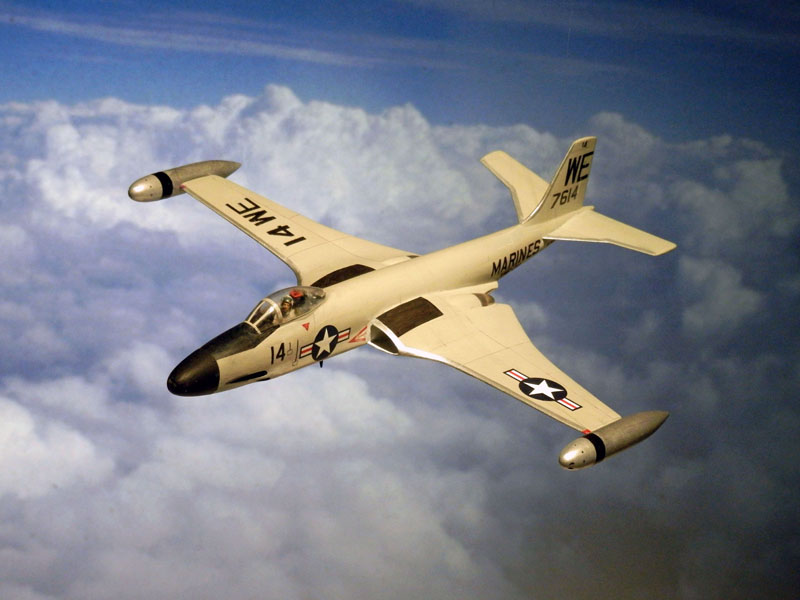 Die F2H Banshee ("Todesgespenst") war 1945 zwar als Weiterentwicklung der FH "Phantom" konzipiert worden, im Ergebnis aber entstand ein völlig neues Flugzeug. m Hinblick auf geringe Anfluggeschwindigkeit für Trägerlandungen zwar noch mit ungepfeilten Tragflächen, jetzt aber mit vier tief liegenden 20 mm Kanonen um Blendung zu verhindern und einer klimatisierten Druckkabine mit Schleudersitz. Mit zwei stärkeren Westinghouse Triebwerken erreichte der neue Mehrzweckjäger F2H-2 bereits beim Erstflug am 11. Jan. 1947 eine Steiggeschwindigkeit von 9,000 ft/min (2,700 m/min), doppelt so schnell wie die F8F Bearcat. An vier optionale Aufhängungen hinter den Lufteinläufen konnten Außenlasten mitgeführt werden (innen auch Atombomben), die Außentanks waren abnehmbar. Die Aufklärerversion F2H-2P wirkte durch ihre um verlängerte Bugsektion besonders elegant. Die späteren Versionen F2H-3 und -4 - ebenfalls mit Foto-Version - unterschieden sich jedoch sowohl vom äußeren Erscheinungsbild als auch intern deutlich von der früheren, noch im Koreakrieg eingesetzten F2H-2. Banshees ersetzten die Grumman F9F-5 "Panther" und wurden ihrerseits 1961 von F9F Cougar und FJ-4 Fury abgelöst. 39 gebrauchte Maschinen gingen an die Royal Canadian Navy.