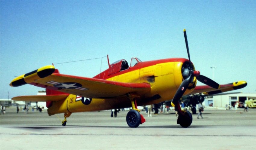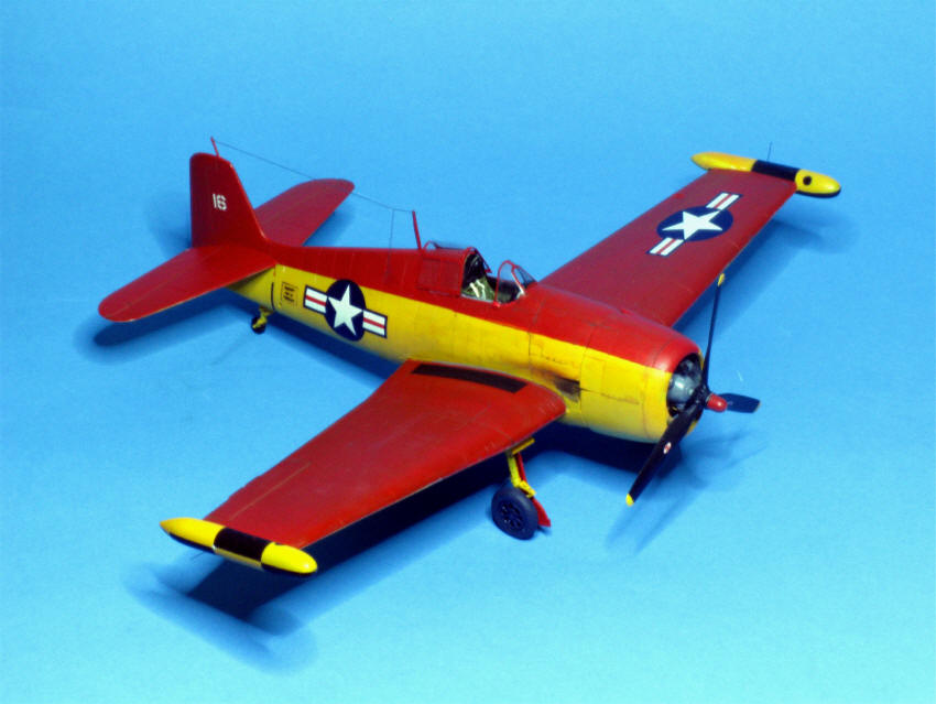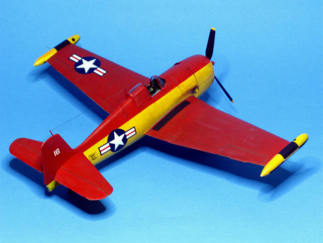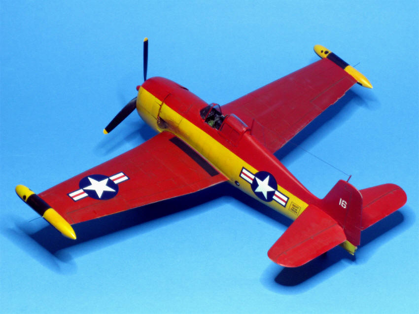 Zur echten Maschine ist leider weder Einheit noch Verwendungszweck bekannt. Das Foto soll von 1951 sein. Lt. Squadron Signal Nr. 36 war die Maschine unten Gelb, oberer Teil des Rumpfs und der Tragflächen Rot , desgleichen das Seitenruder. Behälter an den Flügelspitzen Gelb und Schwarz (alles ohne nähere Definition). Bei genauerem Hinsehen musste aber wohl das ganze Seitenleitwerk rot gewesen sein, während ich bei dem Wenigen, was man von der Flächenoberseite sah, keinen Unterschied zu unten erkennen konnte. Aber Mr. Esposito, der das Foto zur Verfügung gestellt hatte, musste es ja besser wissen. Dachte ich. Als Farben kamen in Frage: "Orange Yellow" (FS 13538), ein sattes Gelb, das auch für Trainer und für die Farbe der Luftschraubenspitzen üblich war. Oberseiten "Insignia Red", FS 11136. Die Nummer 1 der Farbbezeichnung bedeutet "glossy", glänzend, was im Modell aber nicht Hochglanz sein sollte.