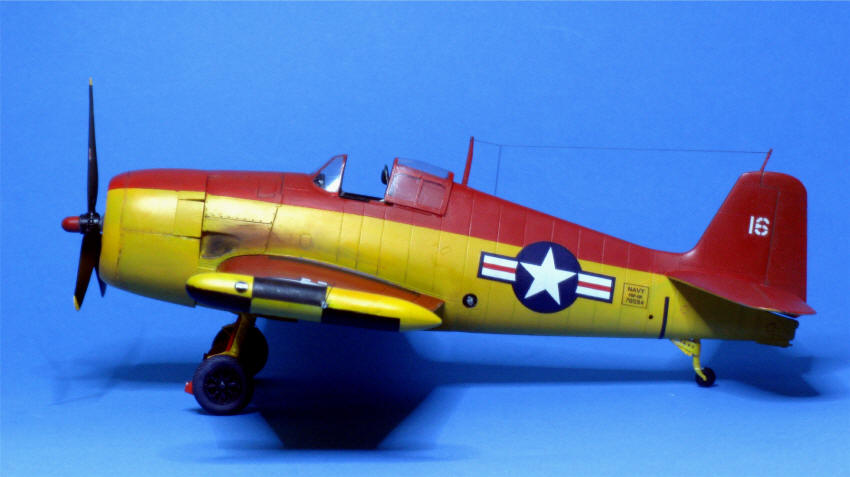 Problematisch war das Cockpit: Mitnichten war es immer "Interior Green" (ANA 611). Diese Farbe wurde offiziell zwar ab 21.12.1942 eingeführt, was aber nicht bedeutete, dass es auch sofort so zu sehen war. Was im Werk schon fertig war, konnte so bleiben, ebenso durften die schon vorhandenen Farben aufgebraucht werden. Das konnte bei Grumman noch einige Zeit "Dull Dark Green" oder auch "Bronze Green", ein dunklerer, braungrüner Farbton, sein. Ab 10.10.1944 (SR-15e) waren alle Partien, die oberhalb der Unterkante des Instrumentenbretts lagen, in "Instrument Black" (FS 37038 ) zu halten. Mir erschien die letztere Version am wahrscheinlichsten.