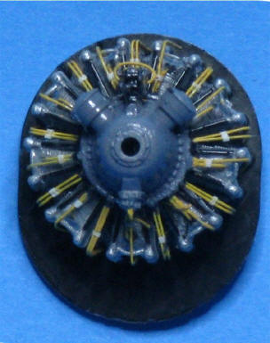 Zündkabel aus bemalten Drähten verhalfen dem etwas rudimentären Hasegawa-Motor zu einem mehr dem Original entsprechenden Aussehen (ein Ätzteil hätte mir nicht gefallen, da die Drähte einen runden Querschnitt hatten). Gehäusefarbe (das Bild täuscht etwas) "Engine Gray". |