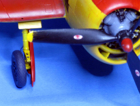 Beim Fahrwerk war genaues Fotostudium erforderlich. Entsprechend den verschiedenen Graustufen erschien mir Insignia Rot für die Fahrwerksklappen und Orangegelb für die Beine am plausibelsten; die Räder kamen offenbar von einer in "Sea Blue" gehaltenen Machine.