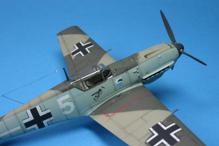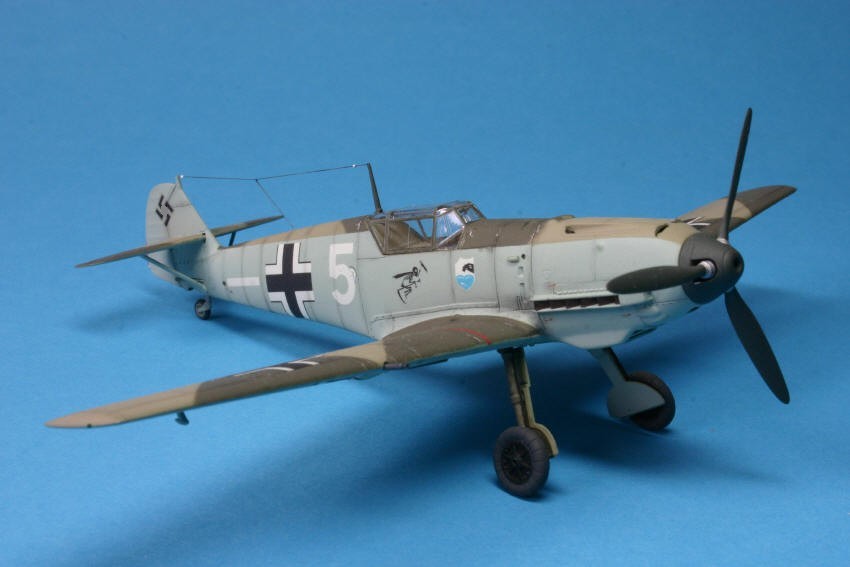 Wohl das beste Modell einer Bf 109 E in 1/72. Eigentlich ist nur der Schlitz für die Gurte im Pilotensitz und die Gurte zu ergänzen. Die Propellerblätter sind vielleicht eine Spur zu schmal, aber dies ist kaum wahrnehmbar. Lackiert wurde die Unterseite mit Humbrol H 65 und die Oberseite mit Gunze RLM 70 und 02.