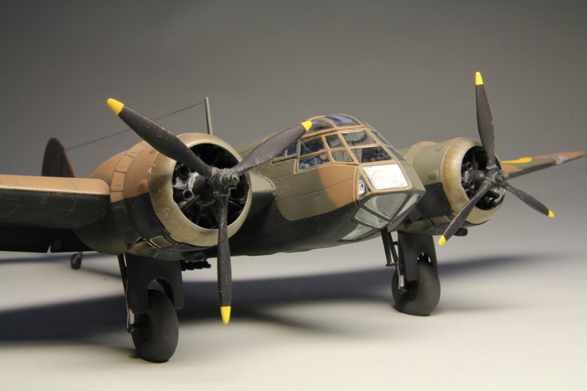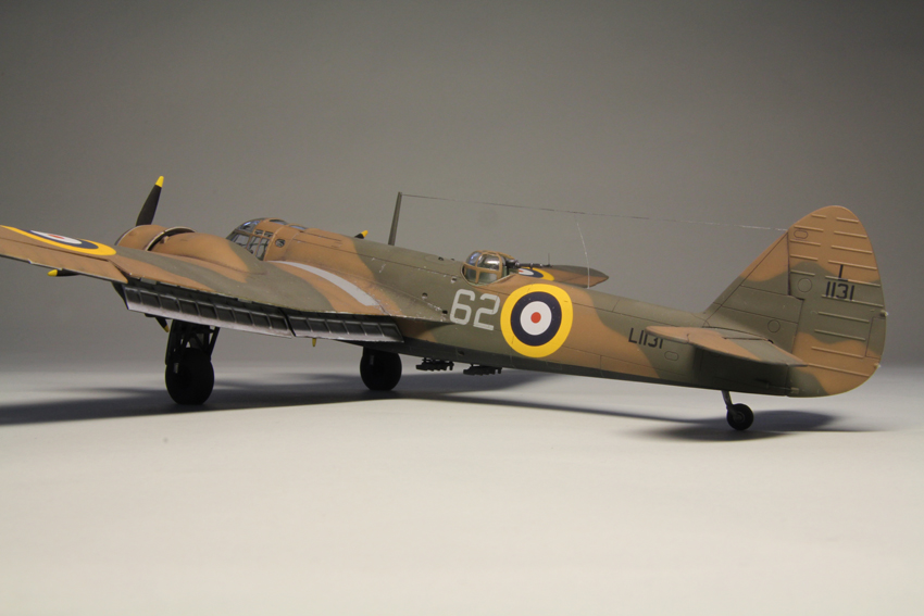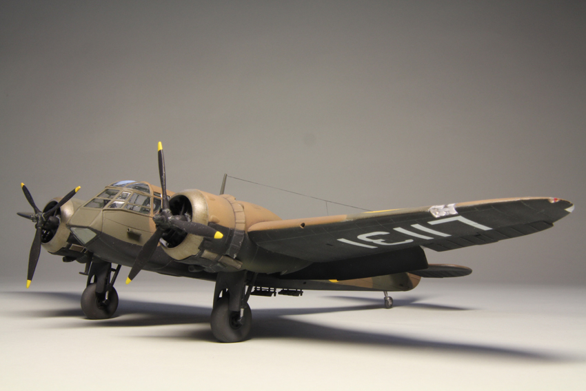 Meine Erwartungen waren sehr groß, nachdem Airfix eine neue Reihe von Blenheim Kits auf den Markt brachte. Endlich konnte ich eine Mk.I, die mich wegen ihrer Vollglaskanzel schon immer beeindruckte, von einem Mainstream-Hersteller bauen und musste nicht auf den Short-Run Bausatz von MPM zurückgreifen. Wie sich bald herausstellte war die Detaillierung außerordentlich gut, was besonders auf das Cockpit zutraf. Eigentlich mussten nur noch die Gurte ergänzt werden und das Ganze ordentlich bemalt und gealtert werden. Aufgrund der guten Einsicht spendierte ich dem Instrumentenbrett auf der Rückseite noch Instrumente aus Rundmaterial und eine Verkabelung. Was aber generell an dem Bausatz zu bemängeln war, ist der auffällige Formenversatz an allen Teilen. Es musste also praktisch jedes Teil nachgearbeitet werden. Da Airfix eine Mk.I und Mk.IV aus dem gleichen Kit konstruierte, ohne einen neuem Rumpf zu fertigen, was heute Hersteller aus Tschechien meist machen, ist das jeweilige Cockpitsegment extra zu bauen und dann an den Rumpf zu kleben. Hier war die Passgenauigkeit sehr schlecht und es musste alles unter Spannung mit Schraubzwingen verklebt werden, um allzu große Spalten zu vermeiden. Nun wollte auch die Cockpitverglasung zu allem Überfluss auch so gar nicht passen. Erst nach dem Entfernen der kleinen ovalen Fenster am Übergang zum Rumpf von der Verglasung gelang es mir die Teile einigermaßen passgenau mit Sekundenkleber unter Spannung zu kleben. Die kleinen ovalen Fenster füllte ich übrigens dann mit Micro Kristal Klear am Ende des Baus. Für die Maskierung der Verglasung verwendete ich das entsprechende Set von Eduard, was außerordentlich exakt passte und eine große Arbeitserleichterung war. Die Maskiersets kosten zwar ihr Geld, aber ich habe sie beim Eday mit 20 % Nachlass bekommen. Dann ist der Preis einigermaßen in Ordnung. So gut die Landescheinwerfer auch ausgeführt sind, die Positionslichter bestehen nur aus Gravuren an den Tragflächenenden. Da mir dies so gar nicht gefiel sägte ich die Teile kurzerhand aus und ersetzte sie durch klares Material. Erfreulicherweise bietet Airfix die Option die Landeklappen ausgefahren darzustellen. Es gibt zwar filigranere aus Ätzteilen, aber ich denke die Bausatzteile sind durchaus brauchbar und so wählte ich diese Möglichkeit etwas mehr Leben uns Modell zu bringen. Am Fahrwerk ergänzte ich die Bremsleitungen und am Leitwerk modifizierte ich noch die Steuerseile indem die angegossenen Bereiche entfernt und mit dünnem Draht ersetzt wurden. Dann konnte auch schon mit der Lackierung begonnen werden. Nach einer Grundierung mit grauem Alclad Primer schattierte ich die Panellinien mit Gunze Tire Black H77 vor. Die beiden Oberflächenfarben Dark Earth H72 und Dark Green H73 von Gunze trug ich nur lasierend auf. Nach dem Abkleben lackierte ich H77 von Gunze auf die Unterseite. Die Panellinien betonte ich zusätzlich mit schwarz. Die Innenbereiche der Panel wurden mit aufgehelltem H77 übernebelt. Nach der Versiegelung mit Glanzlack brachte ich die Decals vom ROP Set 72001 auf, wobei ich die Kokarden nicht verwendete, da mir das Gelb zu grell erschien. Seit Kurzem benutze ich das Panellinewashing von MIG, das speziell auf die zu verwendeten Farben abgestimmt ist. Ich komme damit sehr gut zurecht und die Wirkung des Washings auf der schwarzen Unterseite hat mich sehr beeindruckt. Zum Schluss kommt noch der Mattlack und etwas Alterung mit Pastellkreide und meinem Karismasilver Stift. Fazit: Guter Bausatz, der aber einige Tücken beim Bau beinhaltet.