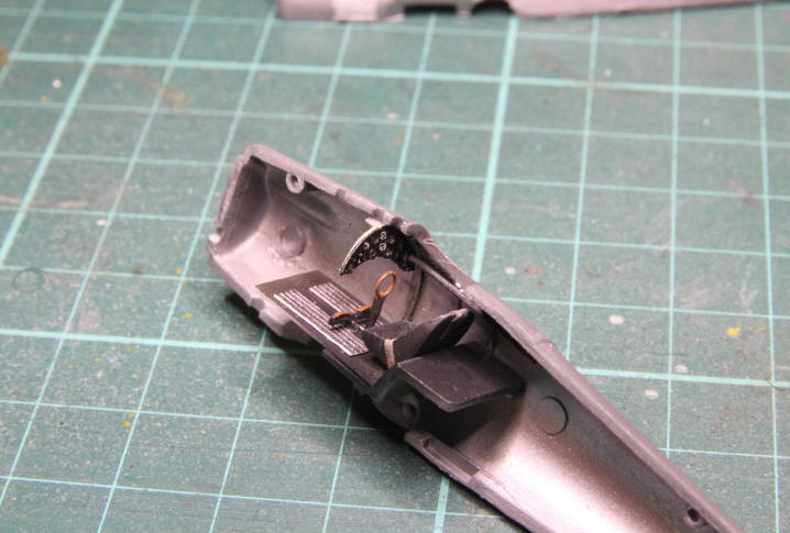 Für den Cockpitbereich fand ich in der Grabbelkiste einen passenden Sitz, sowie ein fast perfektes Instrumentenbrett. Den Boden peppte ich mit Plastikcardstreifen mit entsprechender Bemalung auf.