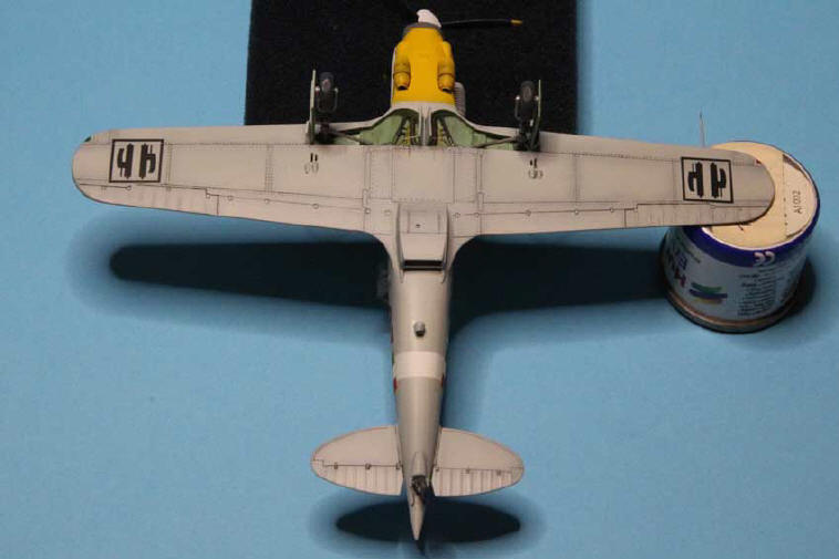 Nachdem der Bau des Modells nun soweit zu Ende war und die Cockpitverglasung mit dem Maskensatz von Eduard abgedeckt wurde, erfolgte die Grundierung mit Gunze Mattweiß. Die Panellinien betonte ich jetzt mit Tireblack ebenfalls von Gunze. Nun konnte schon die vordere Rumpfunterseite mit RLM 04 von Aero Master gespritzt werden. Für das weiße Rumpfband erfolgte eine leichte Übernebelung mit dünner weißer Farbe an der entsprechenden Stelle am Rumpf. Beide Bereiche klebte ich jetzt mit Tamiya Tape ab. Für die Tarnbemalung in RLM 74/75/76 verwendete ich wieder stark verdünnte Farben von Gunze, damit das Preshading sichtbar blieb. Als Glanzlack vor dem Aufbringen der Decals verwende ich immer noch liebend gerne den Lack von Model Master. Die Abziehbilder verwendete ich zum Teil von Italeri und vom Skymodel Decalsatz Nr.34. Alle Decals ließen sich mit Micro Set hervorragend aufbringen und fügten sich in alle Gravuren. Für das Washing benutzte ich die von mir bevorzugten Weathering Produkte von mig, die genau auf die jeweiligen Farben abgestimmt sind. Zum Schluss übersprühte ich das Modell noch mit leicht mattiertem Seidenmatt von Model Master. Nachdem nun noch die Kleinteile angebracht und die Antenne verspannt war, stand das Modell jetzt fertig vor mir. Aufgrund der für eine italienische Maschine ungewöhnlichen Farbgebung ein echter Hingucker, wie ich finde.