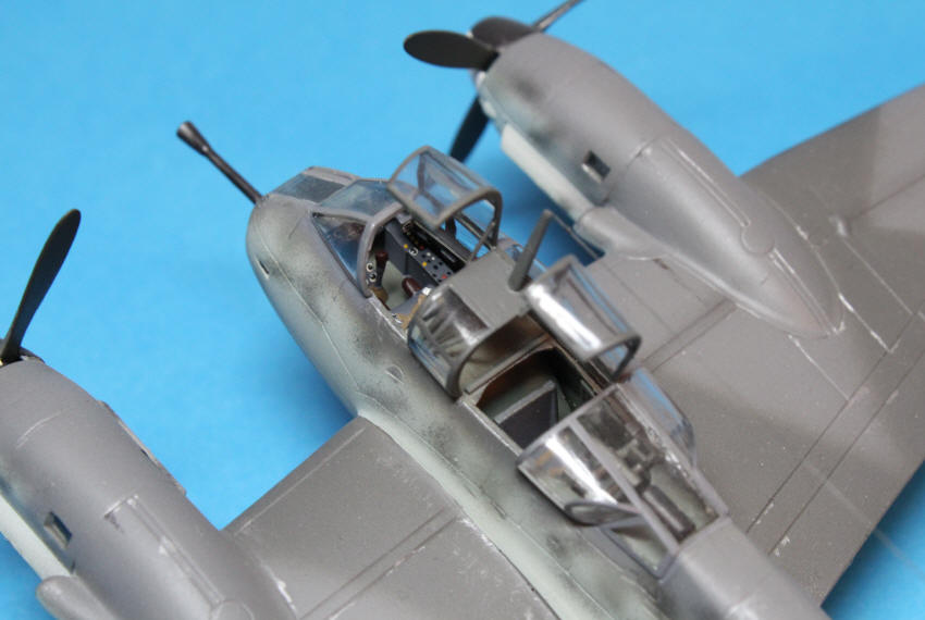 Bausatzkombination aus dem Bilek- (Rumpf) und dem Matchbox- (Tragflächen, Motoren) Bausätzen. Umbau und zusätzliche Detailierung (Cockpit, Kanone, Wgr. 21, …) sehr umfangreich. Heute dank Italeri/ Revell Me 210 aber nicht mehr notwendig. RLM 74/ 75/ 76 mit Gunze Farben lackiert. |