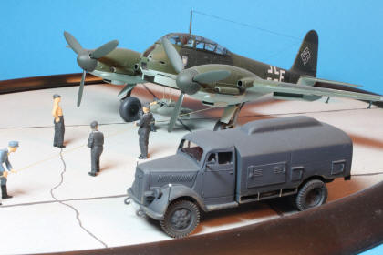 Perfekter Bausatz von Fine Molds, der sich ohne große Probleme bauen läßt. Der Flaschenzug wurde vereinfacht gebaut, ist aber funktionstüchtig. Die Figuren sind von Airfix und Preiser. Der Opel Blitz Grundbausatz ist von Esci, der Tankaufbau ein Umbauresinsatz von Intermodell. Das Kettenkrad ist von Academy. |