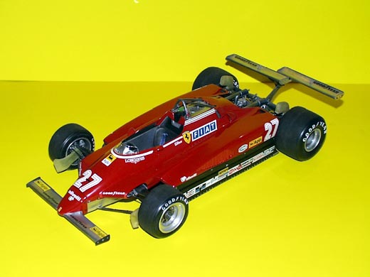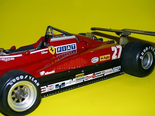 Im Jahr 1979 stellte Gilles nicht nur seine Fähigkeiten, sonder auch seine Fairness und seinen Teamgeist unter Beweis. In Monza hätte er gewinnen können, doch er akzeptierte die Stallorder und ließ Jody Scheckter den Vortritt, der so den Weltmeistertitel nach Maranello holte. In der Saison war Ferrari mit seinen Turbo-Motoren wieder konkurrenzfähig. Dann kam der 8. Mai 1982 Das Original: Vorbild für den Umbau ist das Fahrzeug das Gilles beim GP in Long Beach einsetzte. Mit dem Bausatz können für die Saison 1982 die Fahrzeuge mit den # 057,058,059 gebaut werden. Für den Stadtkurs legte man die Regel für die Heckflügel etwas großzügiger aus und um mehr Abtrieb zu bekommen wurden zwei kleine Flügel versetzt über die gesamte Fahrzeugbreite angebracht. Das Rennen beendet GILLES als dritter, wurde aber auf Grund eines Protestes von TYRELL gegen die Heckflügel disqualifiziert. Der Typ 126 hatte einen V6 Turbomotor und der Konstrukteur für das Chassis das für Ferrari endlich gute Werte brachte war Dr. Harvey Postlethwaite. Für mich war es reizvoll diesen Typ nachzubauen und gleichzeitig einige Verbesserungen am Bausatz vorzunehmen.