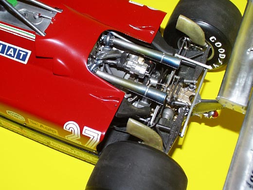 Das Modell: Die Firma PROTAR (PB) aus Italien ist bekannt durch Ihre Motorradmodelle, denn der Gründer PROVINI war ein bekannter Motorradrennfahrer. Im Maßstab 1:12 wurden hauptsächlich FERRARI Modelle FI herausgebracht, ausnahmen ALFA(2), RENAULT(1) und F 40. Einige Modelle wurden in den letzten Jahren von REVELL neu aufgelegt so auch der FERRARI 126. Vorneweg, das Beste an den PB sind die Abziehbilder und die Typenauswahl. Ist man von den TAMIYA Bausätzen in Punkto Perfektion der Teile, Passgenauigkeit und Ausführlichkeit der Bauanleitung verwöhnt, muss man bei PB Abstriche machen. Ohne zusätzliche Hilfen aus der Literatur oder Originalfotos steht man alleine auf der Piste um die dürftigen Farbangaben zu ergänzen sowie nötige Korrekturen und Verfeinerungen vornehmen zu können. Der Bau: Nun zum Bau, ich möchte weniger auf die Ausführung des PB eingehen, vielmehr einige Details zu den Umbauten und Verwendung neuer Materialen berichten. Mein Grundsatz für den Bau in diesen 1:12 Maßstab ist, so viel wie möglich die originalen Materialen einzusetzen. Spoiler/Heckflügel: Frontspoiler mit Alufolie bezogen, der vordere Teil des Flügelprofils (Kantenschutz)ist mittels lackiertem Decalfilm klar dargestellt. Heckflügel, Kernprofil aus Balsa, dann grundiert und mit Alufolie bezogen. Eine Herausforderung sind die Kohlefaser/Carbon Strukturen der Verkleidungen und die Belüftungshutzen der Bremsen.