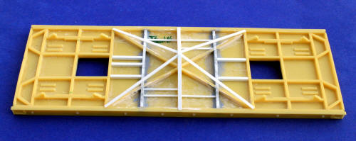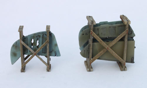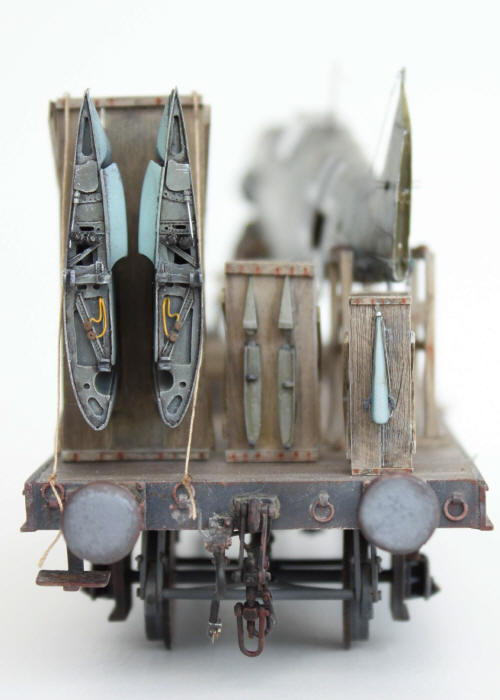 Der Eisenbahnwaggon ist relativ schlecht detailiert. Er wurde mit Bremszylindern, Bremsgestängesteller, Bremsen und funktionsfähigen Kupplungen und Markierungen aus dem Spur0 Eisenbahnbedarf aufgewertet. Die tragende Unterkonstruktion der Ladefläche wurde ebenfalls aus Styrolplatten und –profilen neu aufgebaut. Die Abmessungen und Ausführung der Transportgestelle für die Tragflächen und Ruder, sowie der Transportböcke für den Rumpf  sind in der Wartungsanleitung enthalten.