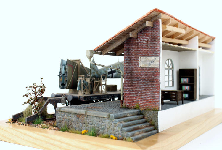 Bf 109 E-4, (Tamiya), German Railcar (Verlinden) , Prellbock (Hauler), Verschiedenes aus dem Spur 0 Modeleisenbahnzubehör; Gebäude und Laderampe , Transportgestelle Scratch gebaut