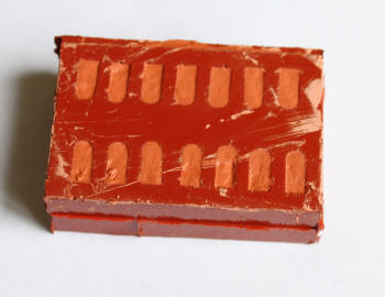 4. In die so erhaltene Form kann man nun die mit etwas Wasser verdünnte Fimo Masse einstreichen. Ich habe terecotta gewählt, weil dann der Grundfarbton der Dachtiegeln über di ganze Bauteildicke vorhanden ist. Das erleichtert einem die Arbeit, wenn man auch gebrochene Dachziegeln darstellen möchte.