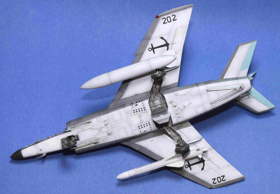 außerdem die Hauptfahwerkräder, die Pylone für den Zusatztank und den Exocetflugkörper,