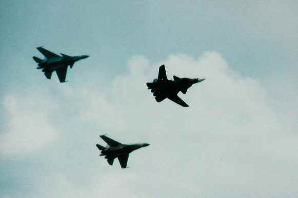 (einsitziger Technologiedemonstrator - analog zur Grumman X-29 - , der jedoch bereits über einen Waffenschacht verfügt. Vorderrumpf, Seitenleitwerk und Fahrwerk von der Su-27. Länge 22,6 m, Spannweite 16,7 m) |